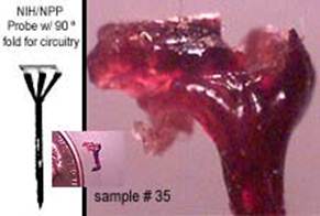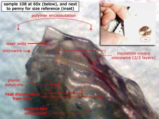 Image 2: sample # 35 compares in size and shape with probe shown in NIH/NPP documentation. Integrated circuitry of active probe appears damaged from structural failure shown here at 60x. This type of probe has been used by Loeb (and Hambrecht) at the NINDS.