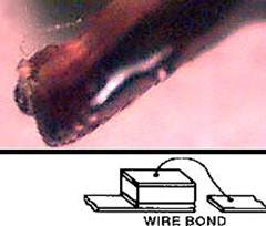 Image 3: Sample # 70 at 60x. A typical wire bond similar to illustration. The substrate appears to have an epoxy or polymer coating.