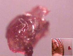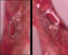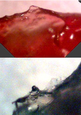 Image 4: Sample # 95 at 60x magnification. Unknown feature that is definitely fabricated and structured to serve a purpose. Two views shown. Summary of Article 1: The photos clearly show something foreign that is not organic mixed with the biological tissue.