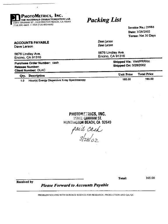 Article 2. - Devices have been analyzed using Energy Dispersive Spectroscopy (EDS): Energy Dispersive Spectroscopy is a common method used for materials composition analysis and is well known within the scientific community. I had samples analyzed at Photometrics in Huntington Beach CA., which has one of the newer era systems that features light detection ability etc., and confirms the presence of Silicon in devices which I have recovered. Silicon is the primary and most common material in semiconductor chips and is not normally present in the body, and in fact is harmful because it contains trace amounts of arsenic. Additionally, other materials were identified such as Chlorine, which is used in the chip manufacturing process, Tin, and Aluminum. Some of the data from EDS performed at Photometrics appears below and complete information is attached to the end of this document. 2.1: EDS Data.4
