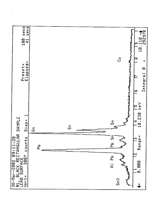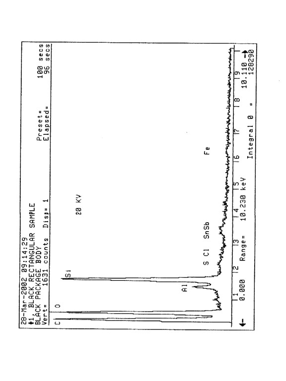 The data for this sample reads left to right as follows (the higher the “peak” the higher the concentration of indicated material): Carbon (C), Oxygen (O), Aluminum (Al), Silicon (Si), Sulfur (S), Chlorine (Cl), Tin (Sn), Antimony (Sb), and Iron (Fe)