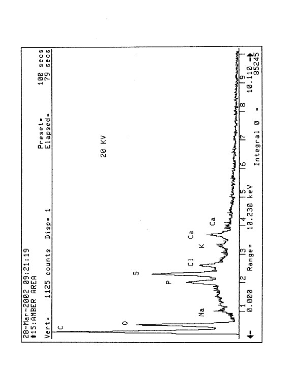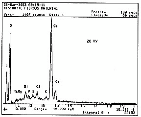 Sample #15, L to R: Carbon (C), Oxygen (O), Sodium (Na), Magnesium (Mg), Silicon (Si), Phosphorus (P), Sulfur (S), Chlorine (Cl), Potassium (K), Calcium (Ca) and (Ca) again. The sample that produced this result is shown below at left