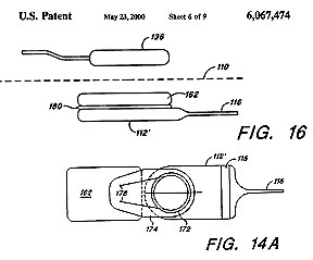 The series of images to the left show my sample #110, and marked-up versions with the blue illustrations showing how my sample #110 compares to U.S. Patent 6,205,361 for a foldable/expandable array of electrodes. My sample #110 is consistent with above invention in that: (1) It has three defined areas at one end, and tapers to one section; and (2) it appears to be on a flexible substrate; and (3) it utilizes a wire perimeter for support.7 3.3 Sample #122 vs. US Patent 6,067,474 “Implantable device with improved battery (capacitor) recharging and powering configuration” - Inventors: Gerald Loeb, Frances Richmond Assignee: Advanced Bionics This patent lists Gerald Loeb (as well as F.J. R., also a principal investigator involved with the NIH microstimulator contract) as the inventors. In sample #122 recovered from my person, a coil (or “antenna”) can clearly be seen on top of the stack and is represented in the patent drawings as the innermost circle refrenced as #172