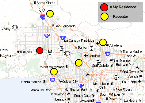 Freq (MHz) Call Sign Location of Repeater Hardware Status / Mode 224.820 - KJ6JY SANTIAGO PEAK (CONDOR) OPEN 224.840 - K6BWA HOLLYWOOD HILLS PRIVATE 224.840 - KA6UFC SAND CANYON PRIVATE 224.840 - KS6E SHERMAN OAKS PRIVATE 224.840 - KS6K SILVERLAKE, L.A. PRIVATE 224.840 - N6EHD ALTADENA PRIVATE 224.840 - WA6MTM YORBA LINDA PRIVATE 224.840 - WB6PRR ALTADENA PRIVATE 224.860 - N6ENV LA COUNTY FIRE CAMP 49 OPEN Information above has been confirmed from three sources: http://www.qsl.net/cora/222_Mhz_Repeater_Guide.htm http://www.geocities.com/CapeCanaveral/Hangar/6847/