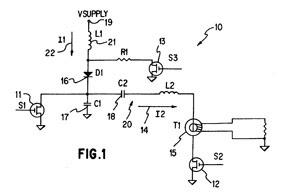 “…When switch 13 is closed, current 22 rises to (Vsupply/R1) with an R1/L1 time constant. Thus, with the proper choice of R1, if switch 13 is closed long enough in advance of the closing of switch 12 (restart), the proper initial condition for current 22 can be achieved. When switch 12 is closed and Class E operation resumes, switch 13 opens, causing current 22 to flow into diode 16 instead of R1. …Elimination of the R1-S3 branch may be possible with an appropriately sized choke inductor 21. In this case, the current 22 is allowed to go to zero, even for "short" off periods.” The above diagram is from their patent and obviously shows accurate information. The diagram that follows however, from NIH QPR #10 contains less “precise” information and further conceals how suspended carrier was being used during contract #N01-NS5-2325 :