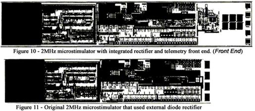 “…we revised the rectifier/data demodulator of MOS8 for integration with existing 2MHz microstimulator circuitry. The existing external diode, amplitude demodulator, and clock recovery circuit were replaced by a new ASIC cell that uses the techniques of MOS8. (Images 10 and 11, above) Presently these chips are under test…” It is reported that the above ASIC “cell”, which finally solves the 4 year old resistor/diode problem “uses techniques” of MOS8. I contend that this “cell” exists on a ASIC design layout that was submitted during the first year of the contract and that Schulman waited until the final QPR#16 to reveal it. This cell could have been present on (and cut from) any number of the early wafer/chip runs that he falsely reported being “unusable”. It is reported multiple times that a “faulty” diode needed to be replaced and is shown again in this instance: “A major effort was expended dealing with the new microstimulator development and in correcting silicon foundry errors via chip microsurgery …a new corrected layout was sent to the foundry for another run of wafers… when the wafers returned, it was observed that they did not work …the design rules provided by the foundry allowed the shorts …by cutting a trace on the integrated circuit, the external diode could be reliably removed. A diode-resistor combination could then substitute for the defective on-chip components.” - Schulman/Loeb/Troyk QPR#1 – March 10, 1995 – June 9, 1995 Again, patent documentation makes argument against Schulman’s reporting, and here he describes how removal of components followed by adding additional small circuitry can actually result in a smaller overall package: Patent 6,035,237: “Implantable stimulator that prevents DC current flow without the use of discrete output coupling capacitors” “The implantable stimulator of claim 3 wherein said first and second circuit means are realized using CMOS transistors configured to function as prescribed circuit elements on the same semiconductor chip …while such DSP circuitry may utilize a significant number of CMOS transistors, configured into appropriate processing and logic circuitry, the overall space required by such DSP or other circuitry on the chip, or a supplemental chip, particularly given the smaller trace sizes associated with modern CMOS devices (0.8 micron and smaller) could still be less than using discrete coupling capacitors (resistor)..18 The repositioning of the bond pads was done to create electrical contacts for attaching the additional suspended carrier/long-range telemetry circuitry which also allowed the elimination of diode/resistor. This activity is not revealed in NIH QPR’s, because Shulman claims that the additional bond pads were needed to attatch the diode and resistor which was cut off of the original chip. Further evidence can be found in U.S. Patents 6,315,721 and 6,164,284 which describe the following: “…The SCU 302 is primarily comprised of (1) a housing, preferably sealed and configured for implantation beneath the skin of the patient's body as described in the parent application in reference to the implanted devices, (2) a signal transmitter in the housing for transmitting command signals, (3) a signal receiver in the housing for receiving status signals, and a programmable controller, e.g., a microcontroller or state machine…” The “state machine” mentioned above is included in the additional circuitry that Schulman used which allowed the elimination of the resistor and diode “…For example, sensor circuitry can be coupled to the electrodes …and provided the sensed data to the controller circuitry. Preferably, the sensor circuitry includes a programmable bandpass filter and an analog to digital (A/D) converter that can sense and accordingly convert the voltage levels across the electrodes into a digital quantity. Alternatively, the sensor circuitry can include one or more sense amplifiers to determine if the measured voltage exceeds a threshold voltage value or is within a specified voltage range. Furthermore, the sensor circuitry can be configurable to include integration circuitry to further process the sensed voltage. The operation modes of the sensor circuitry is remotely programmable via the devices communication interface…” The programmable bandpass filter is also part of the additional circuitry that Schulman integrated after eliminating the diode and resistor during his NIH contract and the additional functionality of the added circuitry enabled bi-directional telemetry over greater distances than with a normal inductively coupled link. In order to sense and monitor as described above in patent text, and also the ability to do so with only 2-5% modulation and switch in 4 clock cycles or less which is described in Schulman’s QPR’s, the “sensor circuitry” mentioned above must be implanted with (onto or next to) the microstimulator. This is in contrast to a typical inductive link where this sensing and monitoring takes place between a coil attached outside the skin and an implanted device where the impedance of the tissue and the increased distance do not allow the low modulation and instantaneous switching. Although much of this evidence pertains to Schulman and Loeb, Phil Troyk worked very closely with them on the Suspended Carrier chip, the back telemetry and also the overall packaging. The fact that it is reported that Martin Schwan performed the removal of diodes and resistors at IIT also suggests that both Troyk and Schwan direct knowledge of Schulman and Loeb’s intent with the device. In email correspondence, Phil Troyk responds to my inquiry about addition of the small circuitry by denying any intent for it to be added to the implanted package and claimed that it was to exist outside the skin, but then in an about face, claims that the idea was “one of the other team members” and that he “saw no benefit to it”. This ema