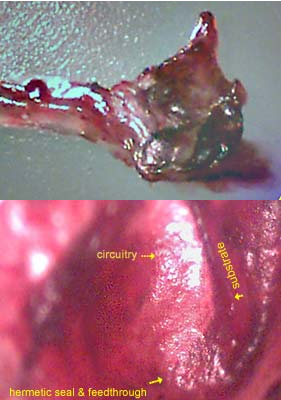Image 1: sample # 50 at 60x magnification (main), and at 10x (inset) with penny for size reference. Circuitry is visible as is the (darker) hermetic feed-through w/ 90º bend for connection to electrode array or other component