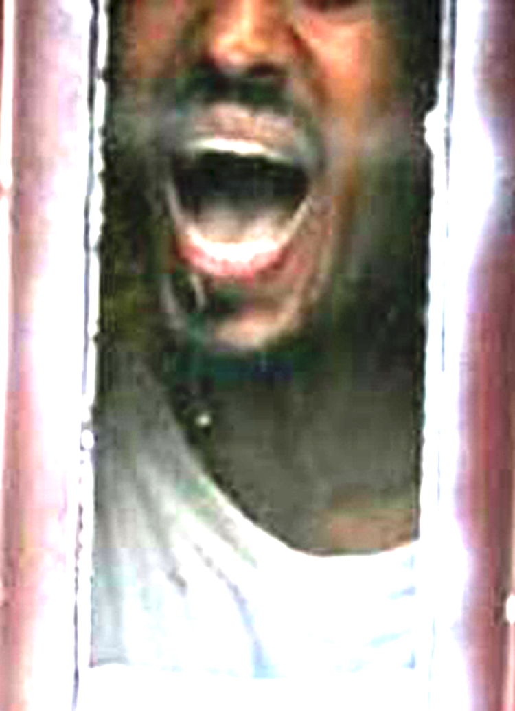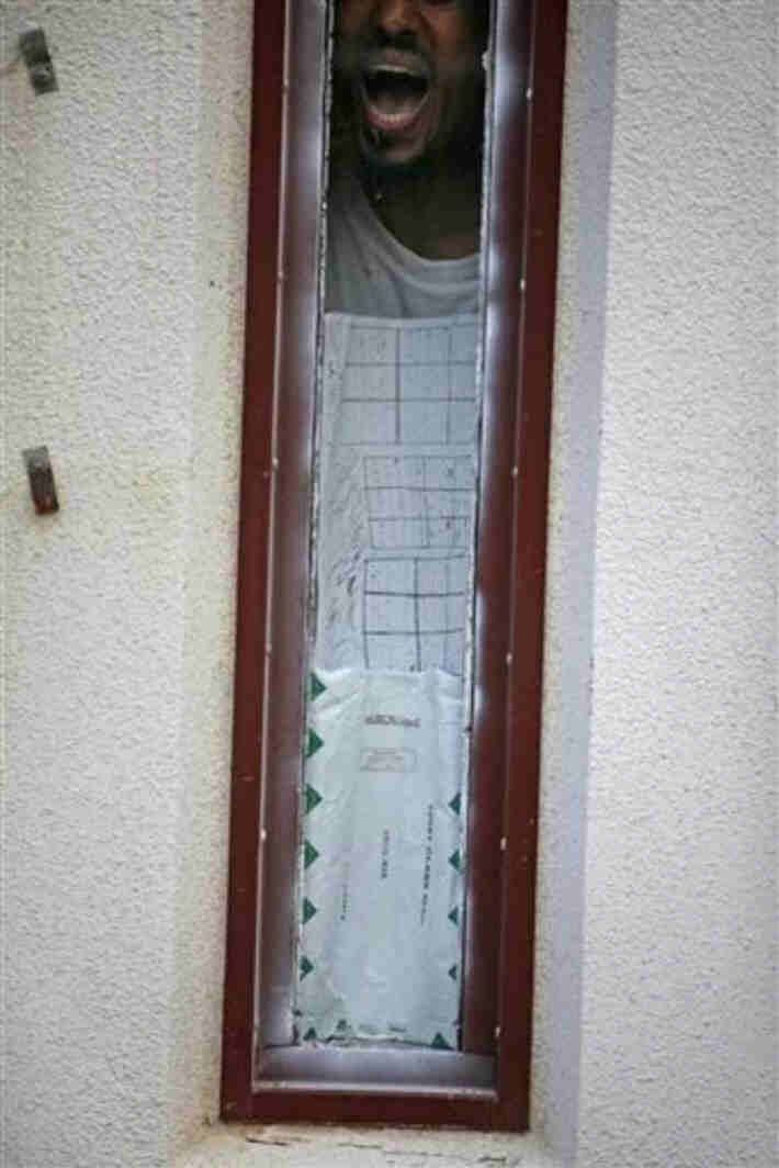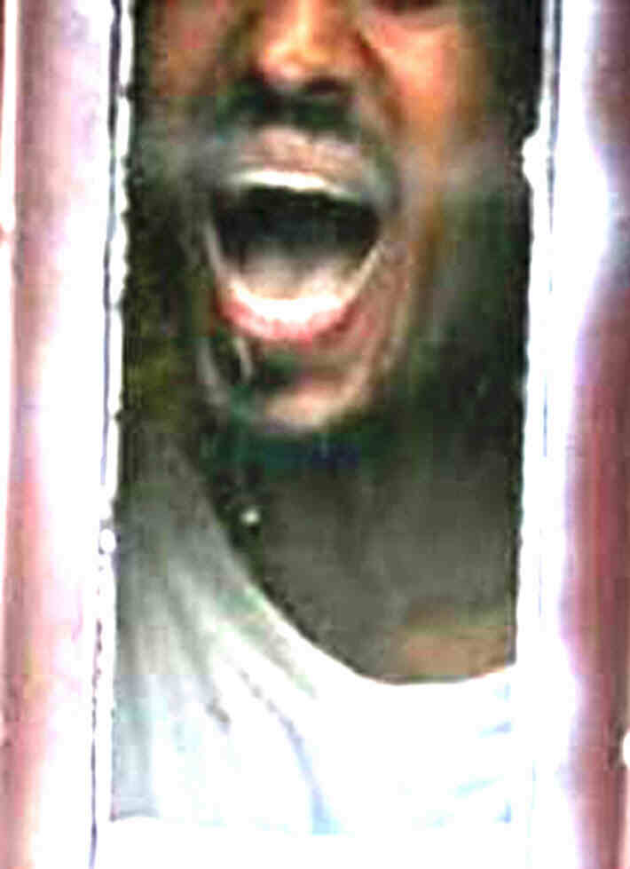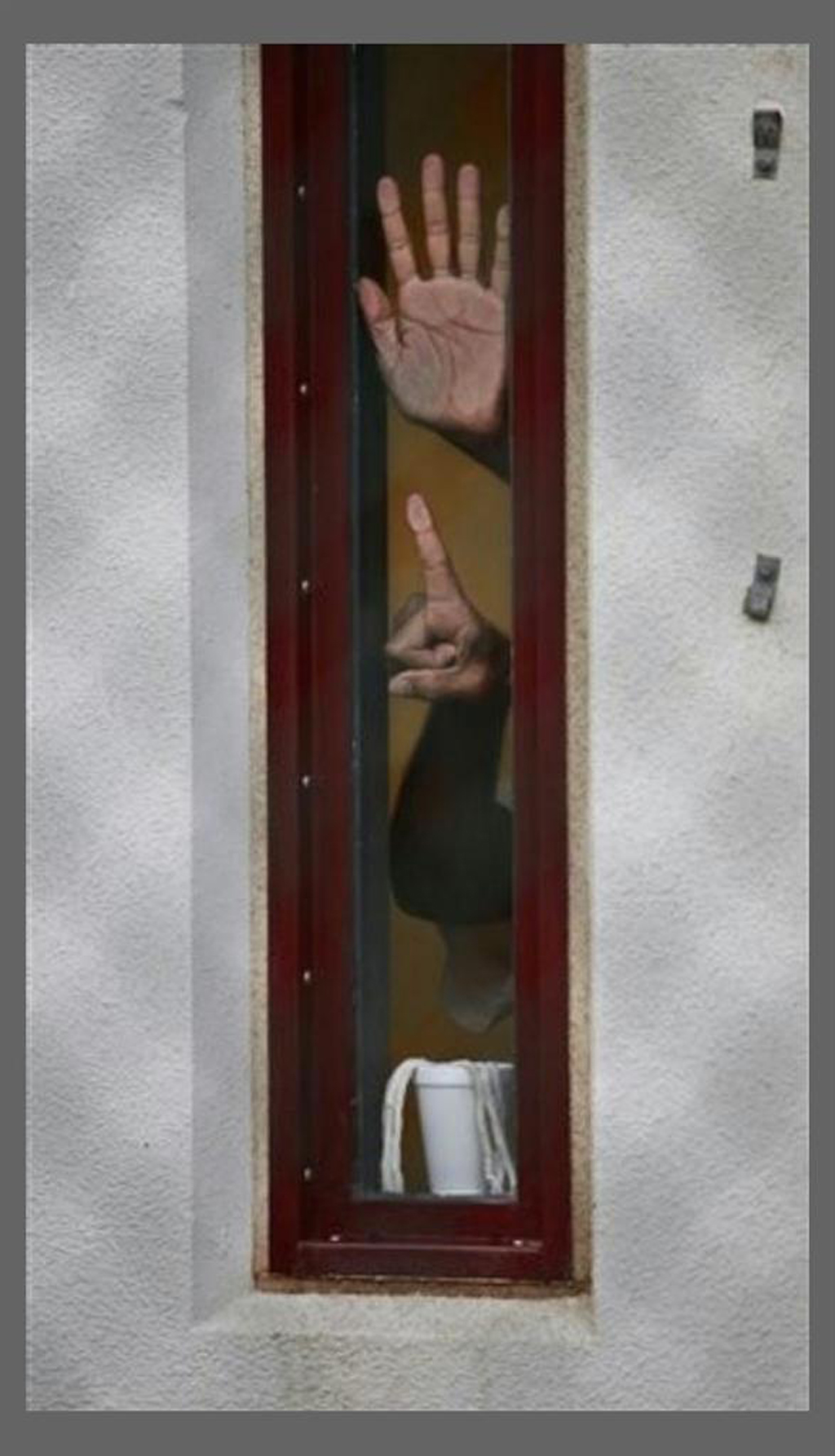 Tortured to Insanity You can see bruising on several locations of the face, what is visible of the left eye looks like a black bruise, This person's lips look dried and cracked from dehydration and his tongue is white as well. It appears as if half his beard has been ripped off his face or he has a huge black bruise on his chin, there appears to be bruising all over the face and possible open wounds. The expression on his face speaks of extreme stress and long term deprivation and mistreatment. Sadly the US will never release these people because they are witnesses and in themselves evidence of torture. It is also clear at this late date that the knowledge that they have about 9-11 would probably show that 9-11 had no terrorist link and was, in fact, an inside job. JAR2 The objects in the window appear to be an envelope, which would be known to whoever sent it to the individual, and some drawings with 9 squares and 6 and 6....9-12??? Anybody's guess... Horrible, and this photo was one which was approved by the US Military. There appears to be purple bruising to this man's left palm. He is clearly trying to send a message. What that may be is not clear to me. Source cryptome.org...Hello Mr. Young 05-20-2009 Tortured to insanity all they can do is scream, their silent screams. Photos taken when prisoners at Guantanamo's Maximum Security Camp 5, saw reporters who were visiting. 05-19-2009 Â öåíòðå Ìîñêâû ãîðèò "Ìàêäîíàëäñ"
