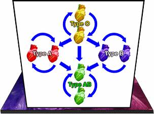 A person with type A blood can receive blood from a person with type A or type O. A person with type B blood can receive blood from a person with type B or type O. A person with type AB blood can receive blood from anyone. A person with type O blood can receive blood from a person with type O only.