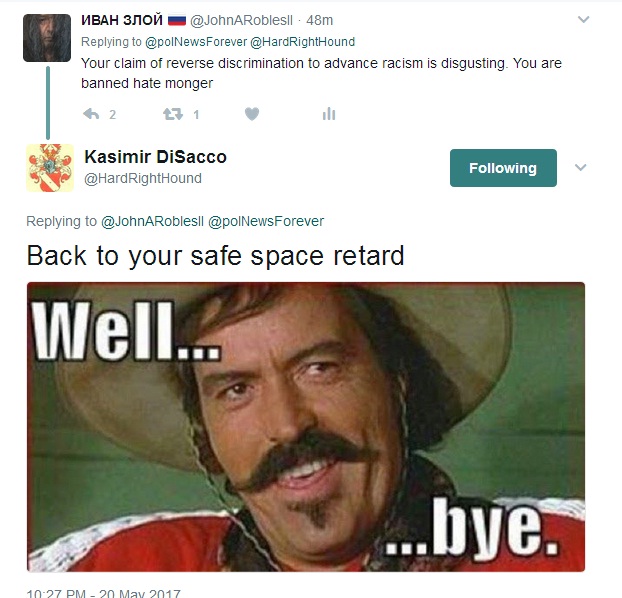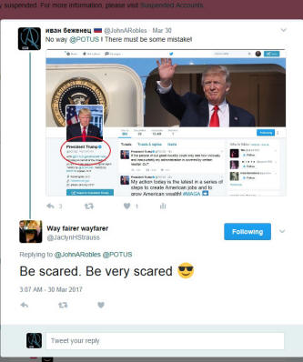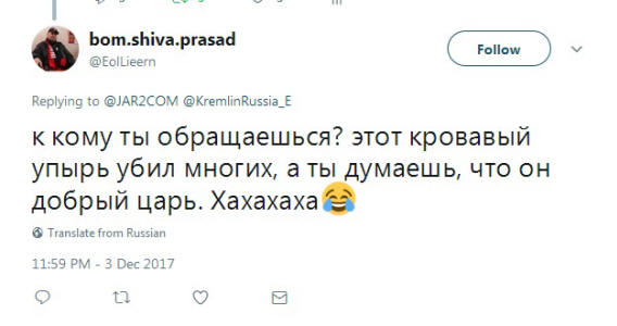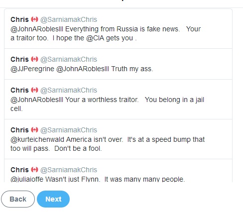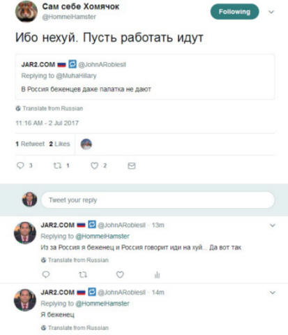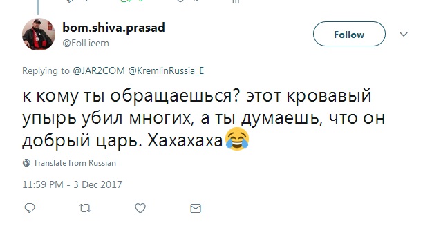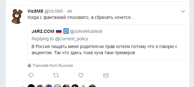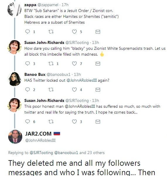 December 11, 2017 All of my life I have been a law abiding "citizen". I never lie. I always worked hard. I never beat my kids or my wives. I never stole or cheated or even used swear words. I always try to respect others and listen to their points of view. I studied and tired to make the best of myself and my life and give something back to this world. After the collapse of the Soviet Union I thought I could somehow be of help in Russia as the people strived to survive and build a new society. The only problem is that I was wrong. There is no one trying to build a new society. There are just people at the top trying to grab and steal all they can and the rest of the people simply trying to stay alive. The problem with the people at the top stealing everything is that they are so corrupt that they will even allow for the destruction of their whole country and the death of millions just to keep what they have stolen and in their attempts to get more. As a racial and ethnic minority of one who has asylum, in other words as a refugee, whom the authorities refuse to give citizenship, and who thus can not get a job and has no benefits or support, I live in absolute terror of the spread of fascism in Russia. The spread of racism in the Untied is expected and their tactics are known and there is nothing anyone can do about it without massive support and we can not get that support. Twitter just deleted my account with 123 000 followers for many reasons, in reality because they are afraid of me but in practicality because of my race. Racism in action in three Tweets.