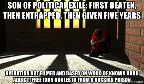 The Case of John Robles III (JAR3) US Supports Murderers, Silent on Innocent Son of Journalist Read all of the bloody details here: FREE JOHN ANTONY ROBLES III Contrary to European and internationally accepted standards and in violation of his rights as a US citizen and a person with political asylum my son was targeted in an entrapment operation and simply used in order to free a known drug addict and police informant who had already done the same thing six times. Corrupt police then demanded first 9 million, then 4, then 2 million, rubles to make the whole thing "disappear". The trial took place with no defense witnesses, no proper counsel and the father has not been allowed to see him once for almost a year. His health is deteriorating, he has lost weight and is subject to beatings and constant humiliation because of his race, national origin and political status.He is never given enough to eat, is kept in overcrowded conditions and there are constant demands for money from the father, namely so he can eat "normally". The prosecution claimed John sold 2 tablets of ecstasy, which were already in the possession of the addict. there was no recording made and the defense and John were not allowed to see the evidence against him because the prosecution said it was "secret". We maintain it was because it does not exist. Even were it true for a first offense and for the minor quantity the 5 year sentence was extreme.We demand a proper investigation take place and that John be freed immediately. The "police" in the area are already known to have run such schemes for years. They plant drugs, then demand huge bribes, take cars, flats or whatever they want from the victims. Many of the people in Lubertsy and Zhulebino where this occurred have lived in terror of these police for years but there is nothing done to stop them. They are even known by the name "Werewolves in Uniform" The longer he is kept in such conditions and I can not find the huge sums of money being demanded I am certain my son will probably die. He continues to be kept isolated and incommunicado. We were just informed that after his appeal failed he will be transported to a prison colony yet know one knows exactly where and it may take 6 months during which he will have no communication whatsoever and no one will know where he is. Again we are afraid he may be killed and that the entire persecution was an attempt to secure a 9 million ruble bribe and silence the father who has been undergoing a political persecution of his own. They do not want the world or anyone for that matter to know the real story or for John or the family to make any noise. The father was being threatened both physically and through communications channels to be silent or he will lose his asylum. The father was also beaten, his landlady threatened until she evicted him and could not find employment. The father was also threatened with the fabrication of a criminal case and had to flee from the area where he lived quietly for almost 20 years in fear for his life. Given the fact that the family has had political asylum since 2007, are not allowed to obtain citizenship, have been the subjects of arbitrary persecution, are literally being destroyed for political reasons, are citizens of the United States and are people with official and internationally recognized political asylum who should enjoy the protection not only of the Russian Federation but the United Nations, we demand that John be freed immediately. Again the younger John Robles has never been politically active, he was just a young person about to get married and working in a company making applications for Android and other phones and his persecution was a way to get the father, secure silence or obtain a bribe. US Supports Murderer Savchenko, Silent on Innocent Son of Journalist READ ABOUT CASE HERE: Press Release by JAR2 on Court Hearing Tomorrow Please help to save John Anthony Robles III