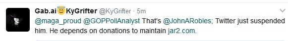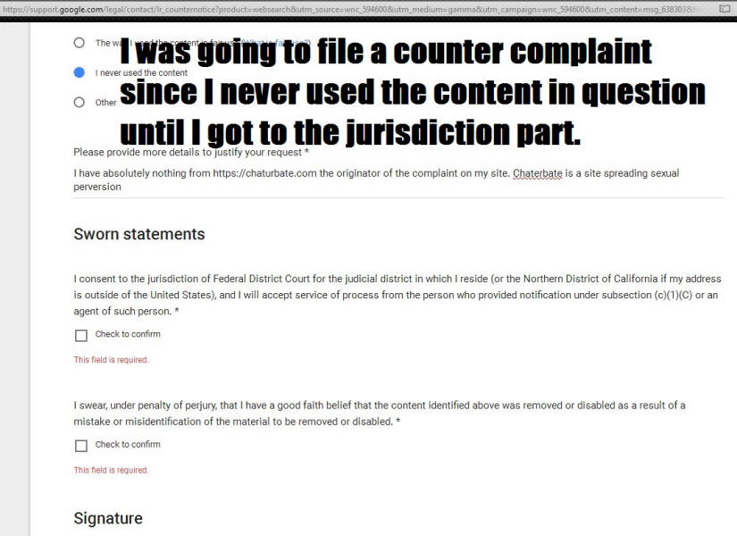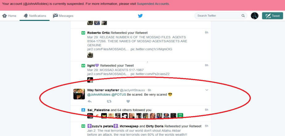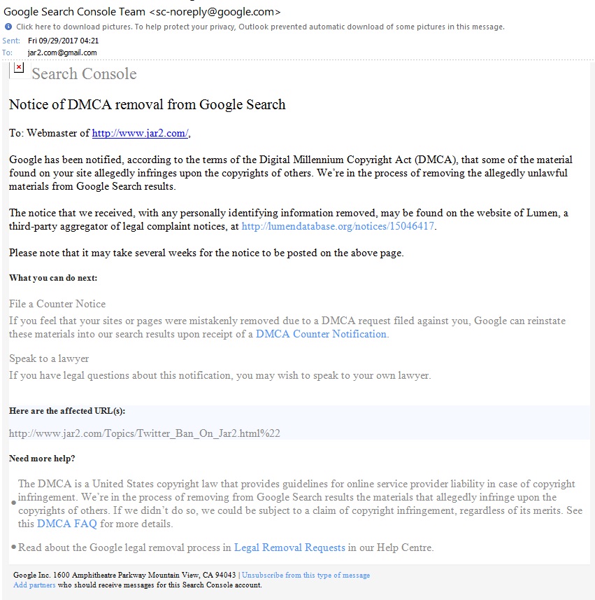 So we investigated. Found the claim to be completely false and wanted to file a "Counter Notification" But this can not be done unless you give them jurisdiction (which we will never do) and which will allow them to serve you with court documents demanding you appear in California to defend yourself even if the claim is false. We dug a little more and discovered the complainant is a California based pedo perversion site which we had never even heard and whose contnent we surely never used on this page http://www.jar2.com/Topics/Twitter_Ban_On_Jar2.html . In Russia this sicko would be arrested immediately. This is the NWO and their "sneaky" little tactics.