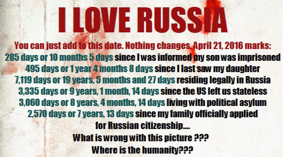My Personal Daily Hell as a Refugee Because I LOVE RUSSIA: I am not an animal or criminal, I am simply stateless and refuse to pay a bribe. What I am going through is insane, I am a Russian patriot for God's sake, but the America lovers and racists with the money want to keep me silent. Since Project Ukraine started and with the appearance of Edward Snowden my application for citizenship was placed on permanent hold, I have been poisoned, lost my job in the media, had my marriage destroyed, have not been allowed to see my newborn daughter, have had known MI-6 assets writing letters deriding me to Russian intelligence, had a new company openly demanding I provide my personal information to the US Government and then terminating me and finally the only family and contact I had has been arrested on serious drug charges in an entrapment operation and continues to be held and treated as if he is a dangerous criminal even though he was set up to let a known drug addict free. Since I have asylum from the United States I can not seek any sort of international legal assistance and all refugee agenices refuse to help me including the UNHCR which is the only body that is SUPPOSED to help. I am getting too old and weak to fight much longer and they know that. Even after my public renunciation of US citizenship in front of millions nothing has changed. There are those who will keep me in limbo until I die and I will fight them to the end. Since I live in complete isolation with no friends or human contact other than work and live under a state of self-imposed house arrest for my own safety I am keeping this blog as the only channel to protect myself and my family.....