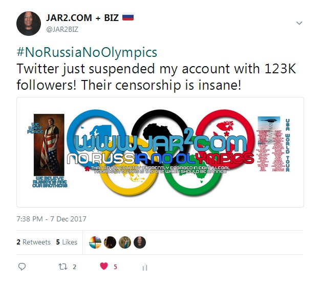 Here the correlation is clear and you do not have to be a detective, investigator or intelligence analyst to see the "coincidence". If you knew my record you know with each suspension (7) I was getting more and more followers. Look at the numbers yourself. Here Q seems to be on my side but wait! That was before my article came out calling the for the US to be banned from the games! Look at the time. This came out after my Olympic article but before my ban! Apparently he is giving someone instruction to take me down and like any Arrogant Intel fuckhead believes I am following him. I never followed him and do not know, from the beginning it seemed like a huge disinformation and distraction operation which is what it is. So yeah those were about my number then I was suspended! The logic was simple, namely the Olympics is a celebration of PEACE and the US was engaged in 9 wars at that moment. In reality this is what all of the countries in the world should have been saying as well as the IOC and the fans, and especially Russians, but no one in the entire world and none of the people I know agreed with me nor said the same thing. No one. Anywhere! Just me and JAR2 calling on bomb happy illegal war waging America to be disqualified. Sincerely people wake up!