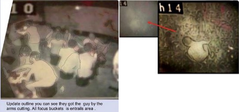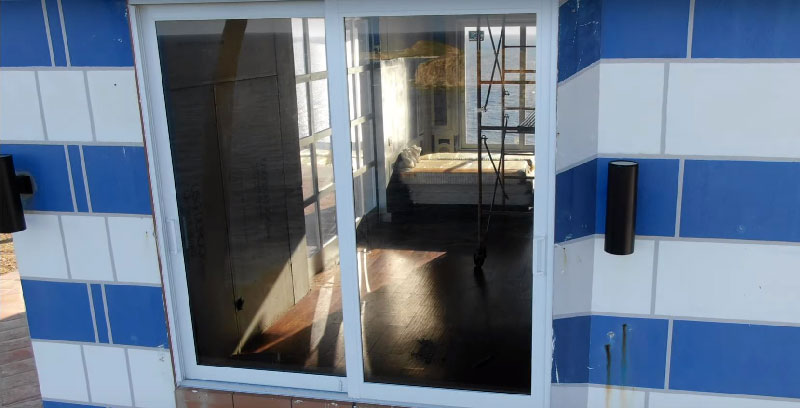 This is not a door. It is painted on the building. The possible doors are on the ocean facing side. This looks like it was sex room with the box spring hiding something and broken pieces of wood lying on the floor. Obviously access was not gained through breaking the windows or fake doors then what? Where is the broken wood from? Perhaps a trap door to the basements was broken up from underneath since the pieces of wood are all over the floor. Source: Files/CPS_PIZZAGATE/Epstein_Island_ Drone_Footage.pdf https://vigilantcitizen.com/latestnews/strange-things-are-happening-on-epstein-island-drone-footage/