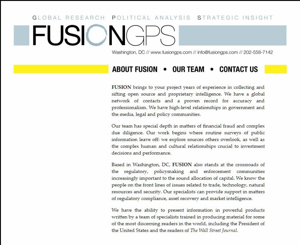 (from left to right) Glenn Simpson, Mary Jacoby, Peter Fritsch, Neil King, Tom Catan According to the original Fusion GPS website (before its content was purged and replaced with a single generic paragraph): “Fusion GPS brings to your project years of experience in collecting and sifting open source and proprietary intelligence”. They also claimed to have a “global network of contacts and a proven record for accuracy and professionalism and having a “high-level relationships in government and the media, legal, and policy communities”. The statement about having a “global network” of resources and “high-level relationships in government” is interesting because Chris Steele makes this identical claim about his own company Orbis. Fusion GPS also prided itself on its team of experts that had special depth in matters of financial fraud and complex due diligence. Their value proposition was described as: “Our work begins where routine surveys of public information leave off: we explore sources others overlook, as well as the complex human and cultural relationships crucial to investment decisions and performance”.