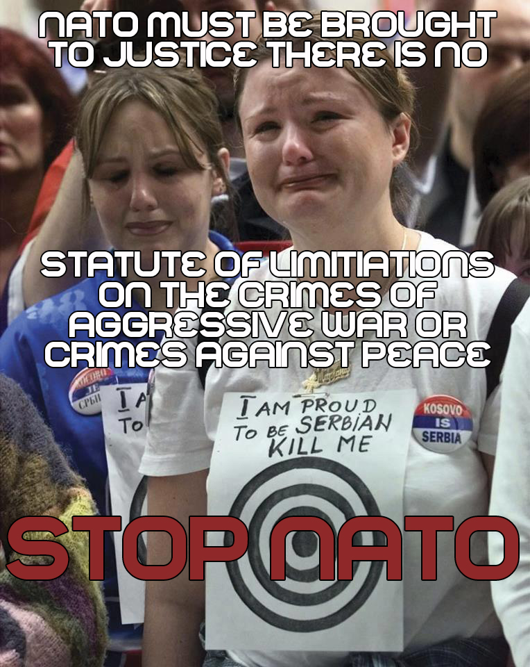 - Since this is a crime against peace and humanity and a gross violation of the basic provisions of the international law, NATO Member States bear full legal responsibility for the aggression, including liability for the inflicted damage on the order of more than USD 100 billion, as well as responsibility for the use of weapons with depleted uranium and other illicit ordnances of mass destruction. Serbia has the right to initiate the proceedings before the competent international forums against NATO Alliance and all of its member states participating in the aggression, for the purpose of exercising the right to war damage compensation to Serbia and Montenegro as well as to individuals who suffered from aggression.