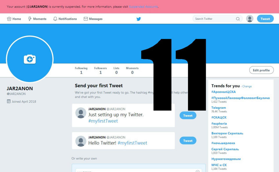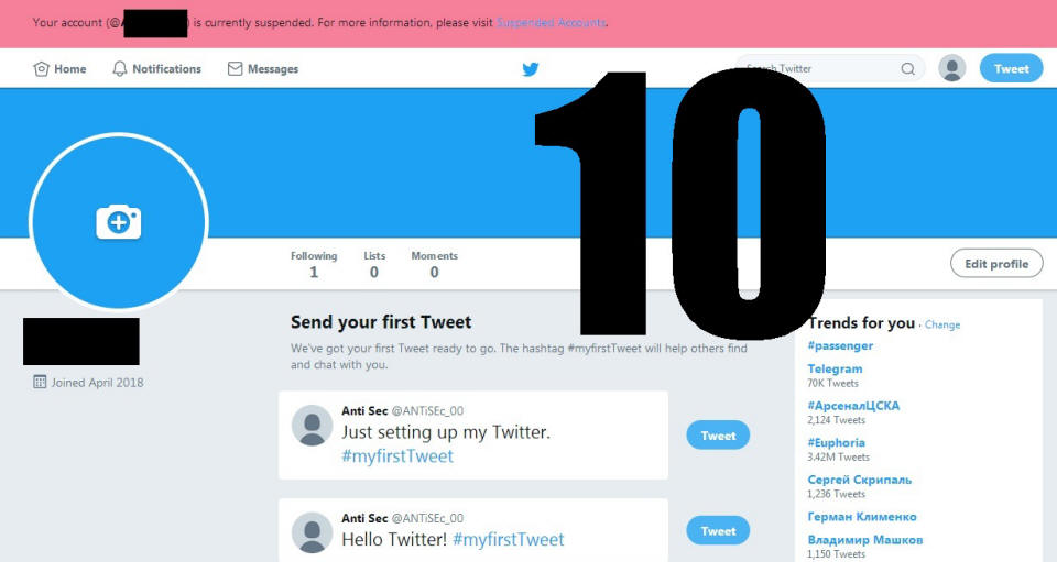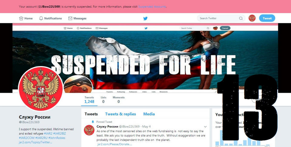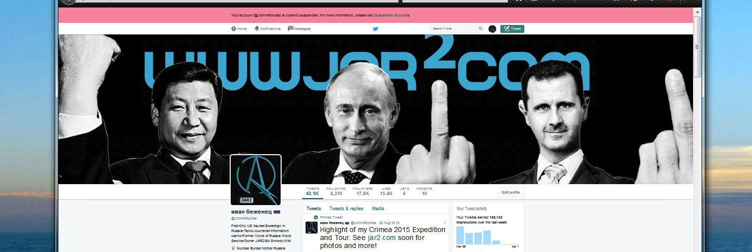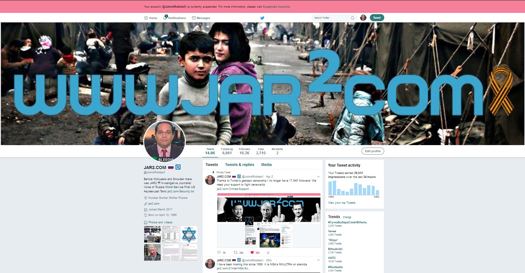 Twitter needs to be banned from Russia. I have no words anymore for these bastards! This must be a first. A suspended account which did not even post its first Tweet and followed one 16,800 Readers 123,000 Readers https://twitter.com/JohnARoblesIV https://twitter.com/JohnARobles3 https://twitter.com/JohnARobles2 https://twitter.com/JohnARobles1 https://twitter.com/JohnARoblesIII 10,300 Readers https://twitter.com/JohnARoblesII 17,800 Readers https://twitter.com/JohnARobles