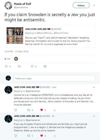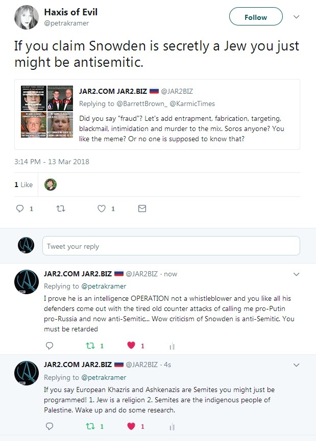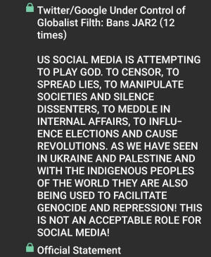 PROJECT BLUEBIRD Twitter/Google Under Control of Globalist Filth: Bans JAR2 (13 times) The Last Time the Support Account Below https://twitter.com/JBow22U369 US SOCIAL MEDIA IS ATTEMPTING TO PLAY GOD. TO CENSOR, TO SPREAD LIES, TO MANIPULATE SOCIETIES AND SILENCE DISSENTERS, TO MEDDLE IN INTERNAL AFFAIRS, TO INFLUENCE ELECTIONS AND CAUSE REVOLUTIONS. AS WE HAVE SEEN IN UKRAINE AND PALESTINE AND WITH THE INDIGENOUS PEOPLES OF THE WORLD THEY ARE ALSO BEING USED TO FACILITATE GENOCIDE AND REPRESSION! THIS IS NOT AN ACCEPTABLE ROLE FOR SOCIAL MEDIA! The Creator of Operation Snow Den Was Watching My Page Before Ban http://www.jar2.com/Topics/Snowden.html